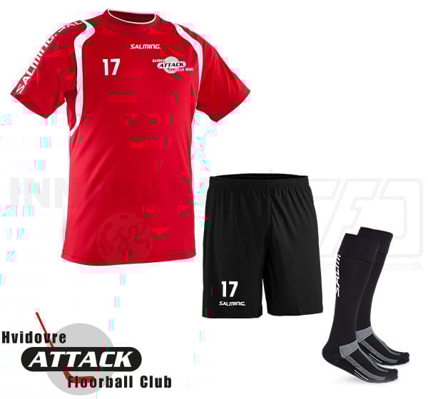 Hjemmebane spillesæt der anvendes i Hvidovre Attack Floorball Club.Sættet er inkl. 1x Hjemmebane T-shirt, 1x Shorts og 1 par Sokker.